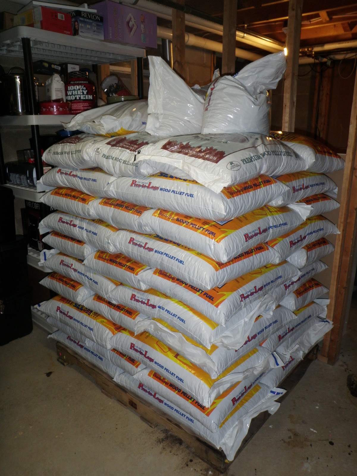 We started off our Sunday with a trip to Petsmart (Lucy's favorite store, of course) then dropped her off at home while we ran some errands. We decided it would be wise to stock up on wood pellets while A. they were on sale and B. the weather was still nice enough to make loading/unloading them not too much of a pain. So we loaded up with a full ton of pellets (50 bags!!) and headed home to unload. Just in case you were wondering what a ton of pellets looks like (you were... weren't you?)... it looks like this...